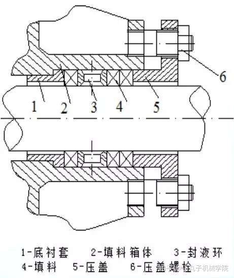 盘根通常由较柔软的线状物编织而成,通过截面积是正方形的条状物填充在密封腔体内,靠压盖产生压紧力,压紧填料,迫使填料压紧在密封表面(轴的外表面和密封腔)上,产生密封效果的径向力,因而起密封作用。